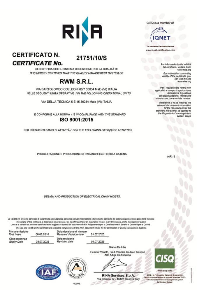 L’affidabilità di RWM quale costruttore di paranchi elettrici a catena è confermata dall’applicazione del sistema qualità ISO 9001:2015.